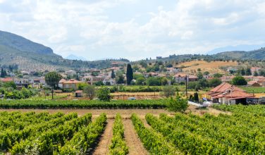 tiled roofs. The mountains and the deep blue waters of the Aegean Sea add to the beauty of the area.